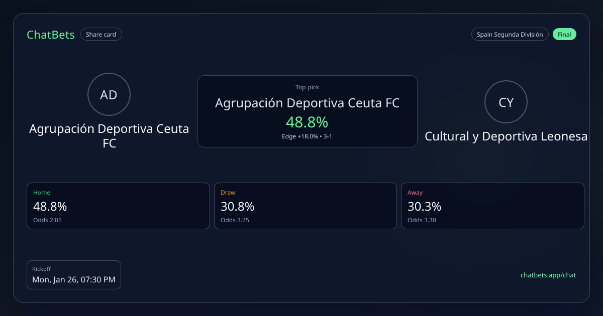 Agrupación Deportiva Ceuta FC vs Cultural y Deportiva Leonesa prediction card