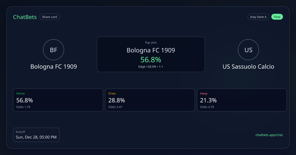 Bologna FC 1909 vs US Sassuolo Calcio prediction card