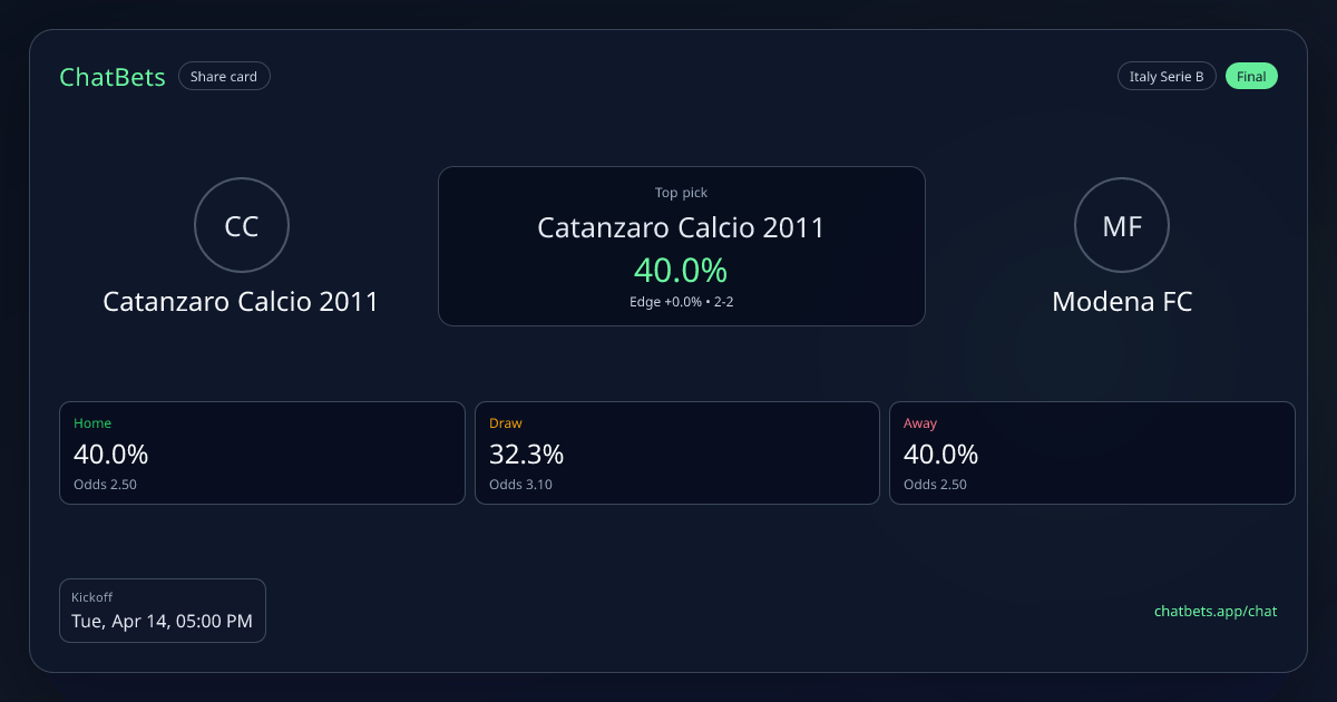 Catanzaro Calcio 2011 vs Modena FC prediction card