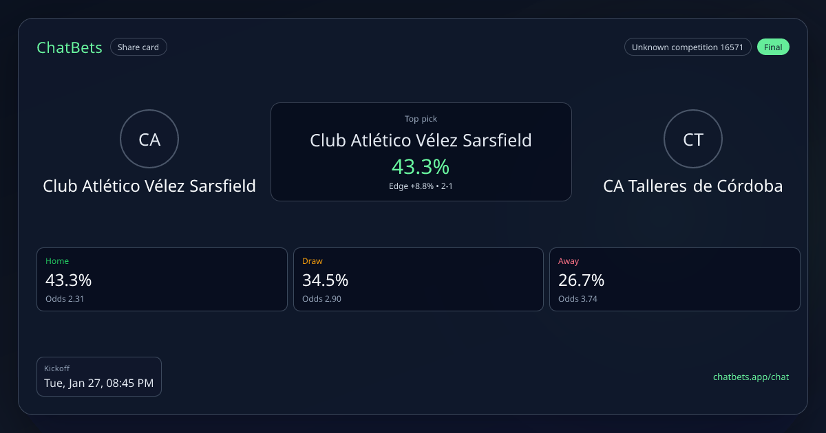 Club Atlético Vélez Sarsfield vs CA Talleres de Córdoba prediction card