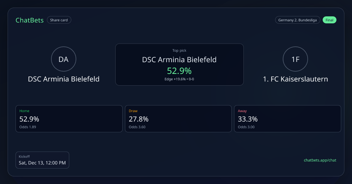 DSC Arminia Bielefeld vs 1. FC Kaiserslautern Prediction Card | ChatBets