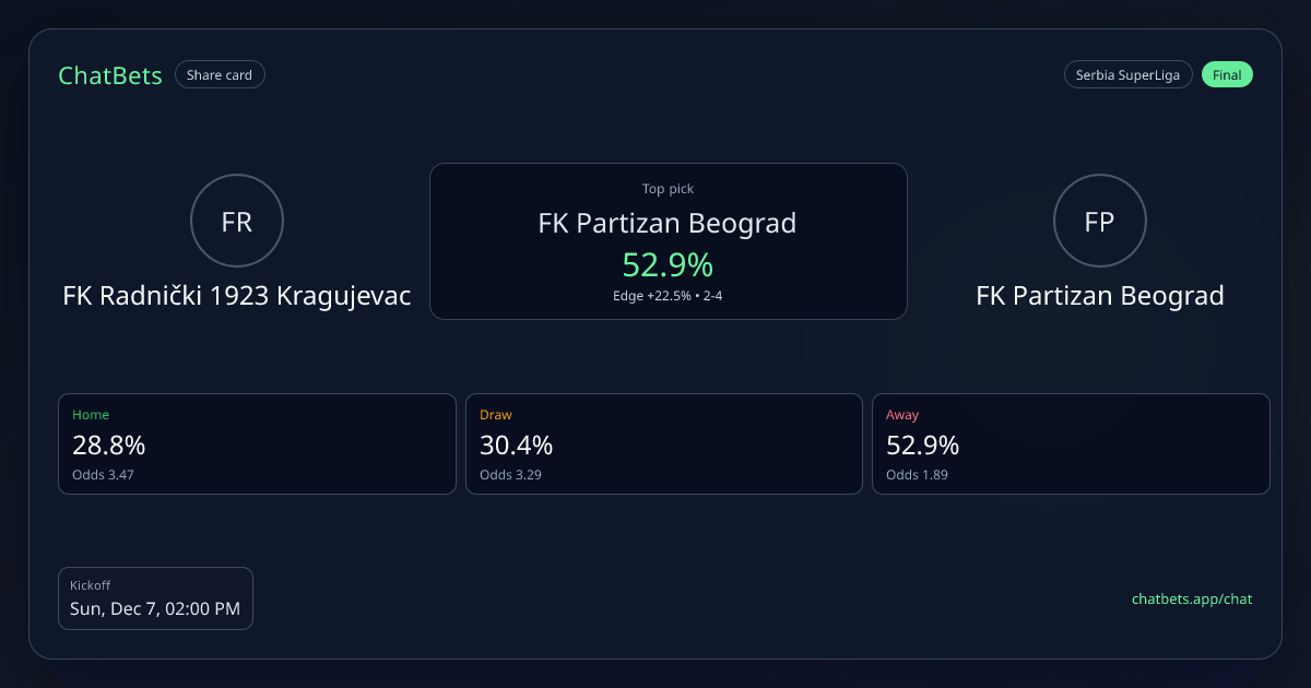 FK Radnički 1923 Kragujevac vs FK Partizan Beograd prediction card