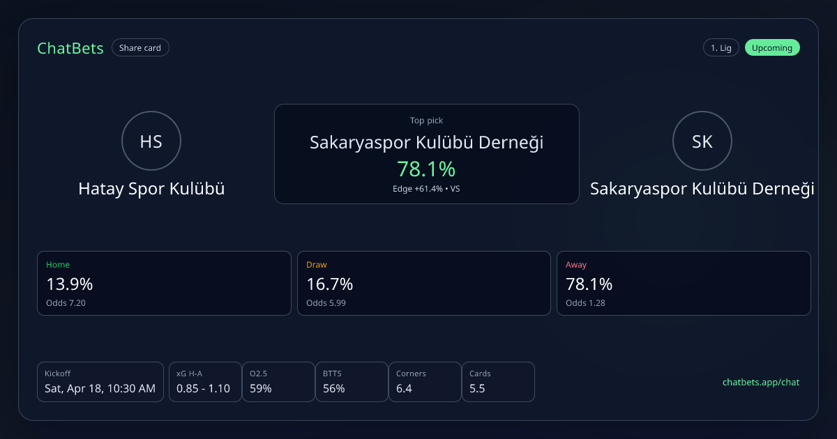 Hatay Spor Kulübü vs Sakaryaspor Kulübü Derneği prediction card