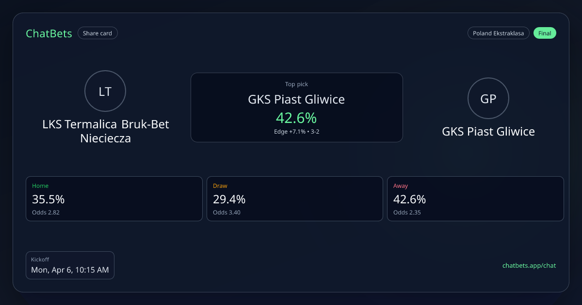 LKS Termalica Bruk-Bet Nieciecza vs GKS Piast Gliwice prediction card