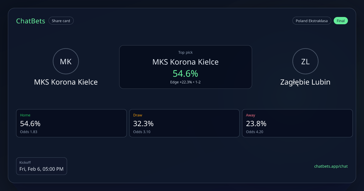MKS Korona Kielce vs Zagłębie Lubin Prediction Card | ChatBets