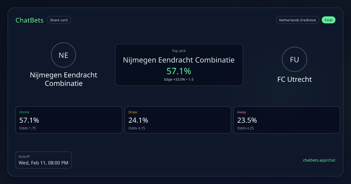Nijmegen Eendracht Combinatie vs FC Utrecht prediction card