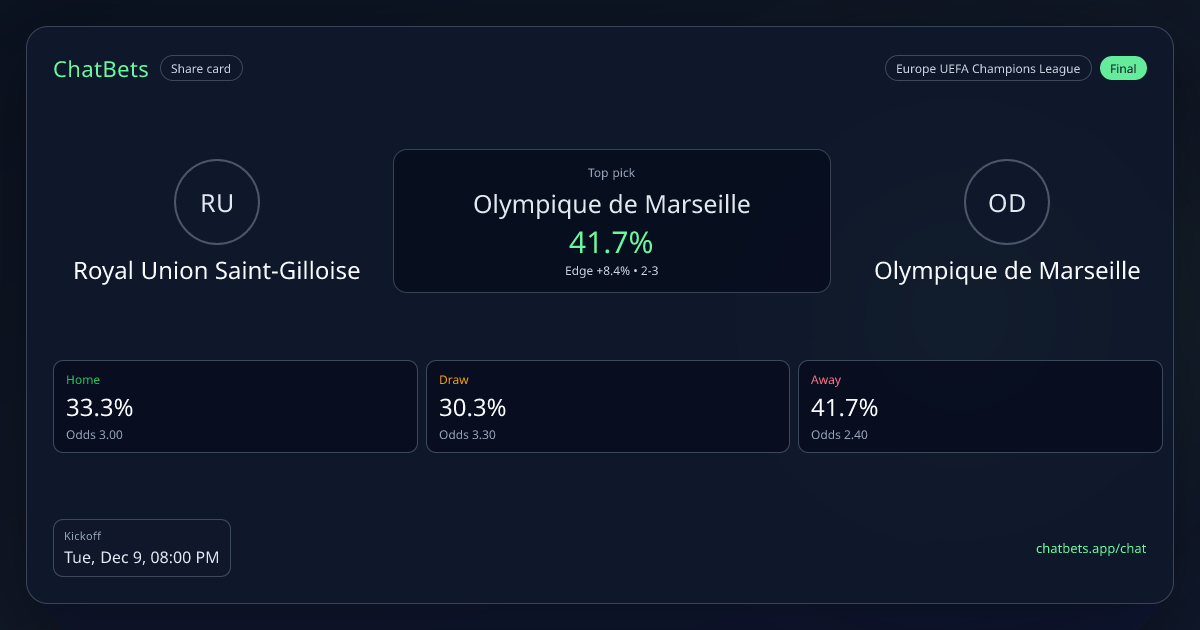 Royal Union Saint-Gilloise vs Olympique de Marseille prediction card