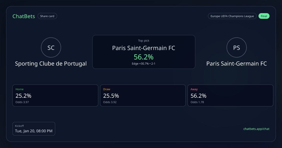 Sporting Clube de Portugal vs Paris Saint-Germain FC prediction card